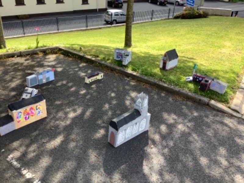 P1 have been looking at the buildings in the village. They have created Newmills using boxes from the recycling bin which they have then decorated. Can you recognise the buildings?