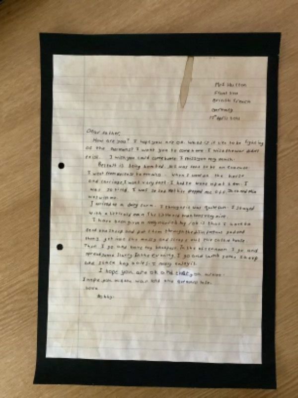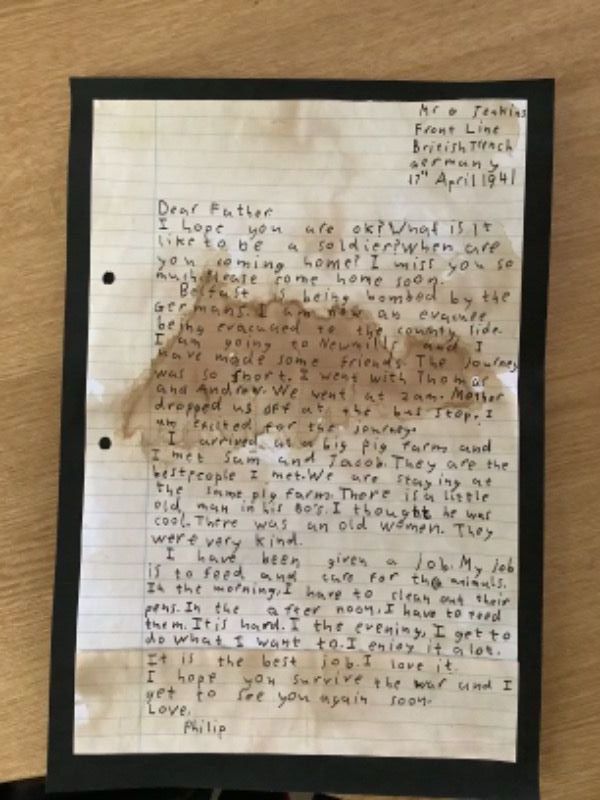 Primary Four have been working incredibly hard during literacy producing fabulous pieces of creative writing! The children have created wonderful letters to their fathers who were fighting on the front line, telling them about their experience of being evacuated away from city life due to the Belfast Blitz to the countryside in Newmills.
